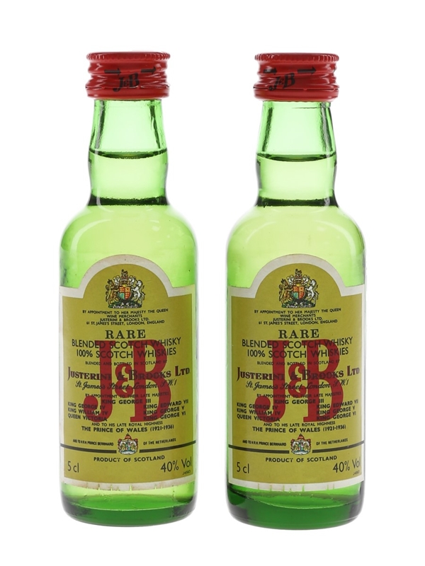 This lot contains two miniature bottles of J & B Rare Blended Scotch Whisky produced by Justerini & Brooks Ltd. We estimate these were bottled in the 1980s.