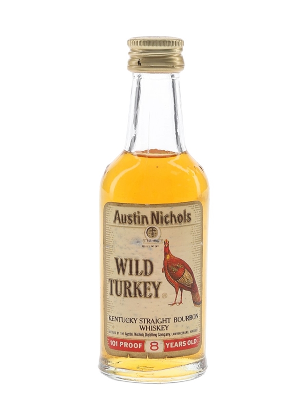 A miniature bottle of Wild Turkey 8 Year Old 101 Proof Kentucky Straight Bourbon Whiskey, bottled at 50.5% ABV by Austin Nichols Distilling Company, Lawrenceburg, Kentucky. We estimate this was bottled in the 1970s.