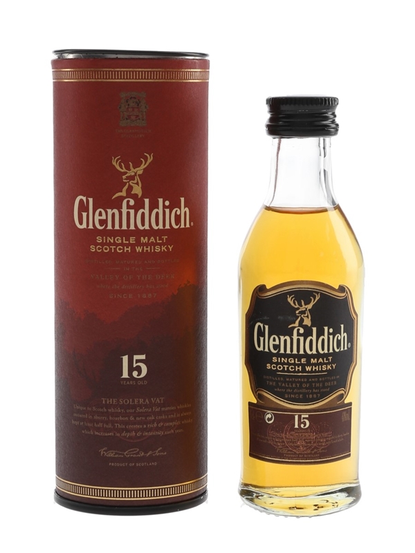 A miniature bottle of Glenfiddich 15 Year Old Single Malt Scotch Whisky. The spirit is matured in three different cask types: bourbon, sherry, and new oak, before marrying in a large hand-made cask called a solera vat.