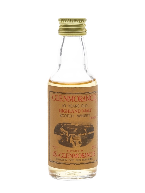 A miniature bottle of Glenmorangie 10 Year Old Single Highland Malt Scotch Whisky. We estimate this was bottled in the 1970s.