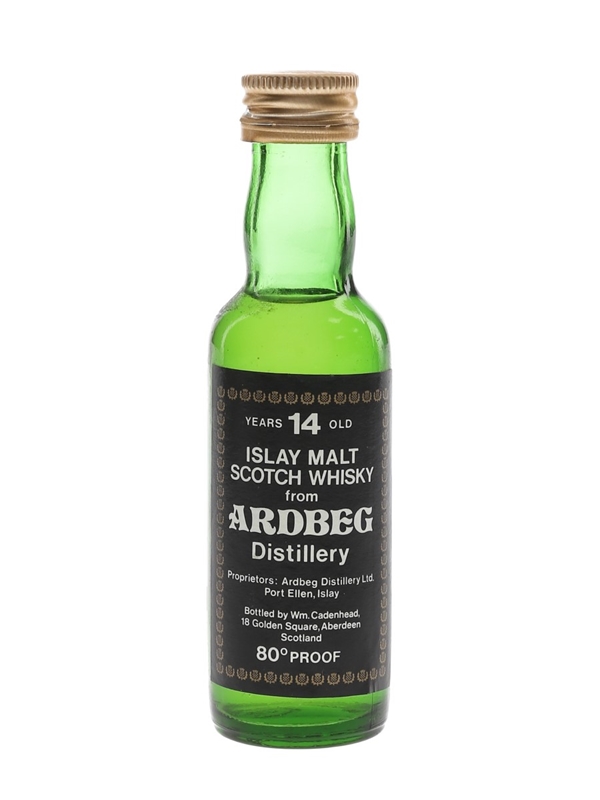 A miniature bottle of Ardbeg 14 Year Old Islay Malt Scotch Whisky, distilled by proprietors Ardbeg Distillery Ltd. This was bottled by Cadenhead's, we estimate in the 1970s.