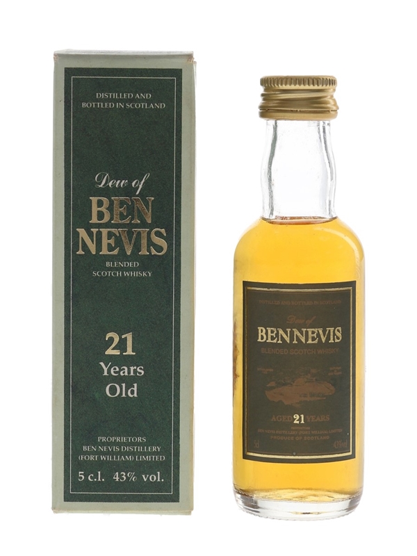 A miniature bottle of Dew of Ben Nevis 21 Year Old Blended Scotch Whisky, distilled and bottled at Ben Nevis Distillery (Fort William) Limited.