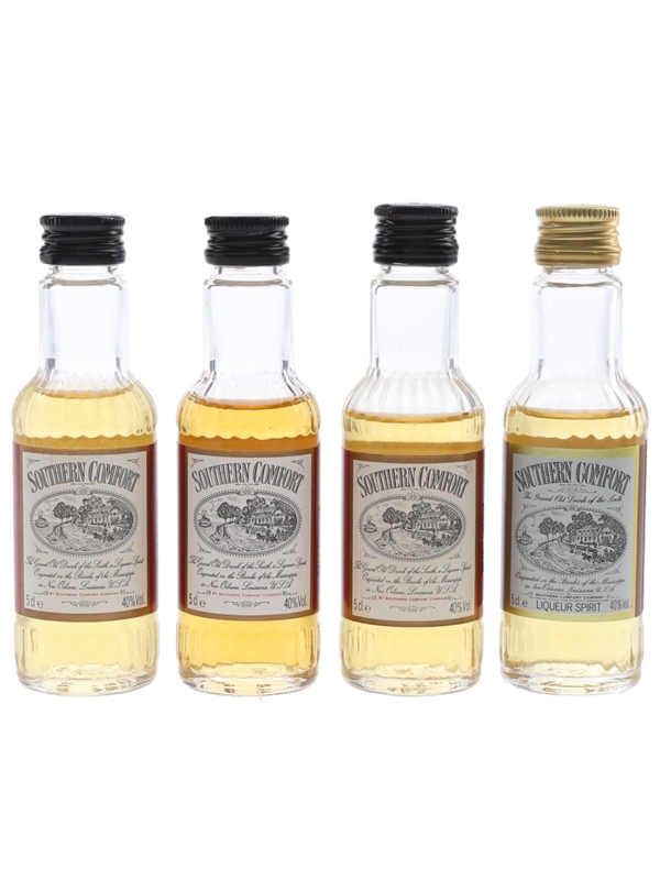 This lot contains four miniature bottles of Southern Comfort Whiskey Liqueur, The Grand Old Drink of the South, produced of the United States and Ireland.