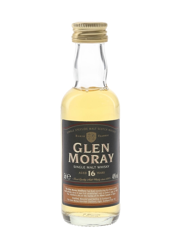 A miniature bottle of Glen Moray 16 Year Old Single Speyside Malt Scotch Whisky.