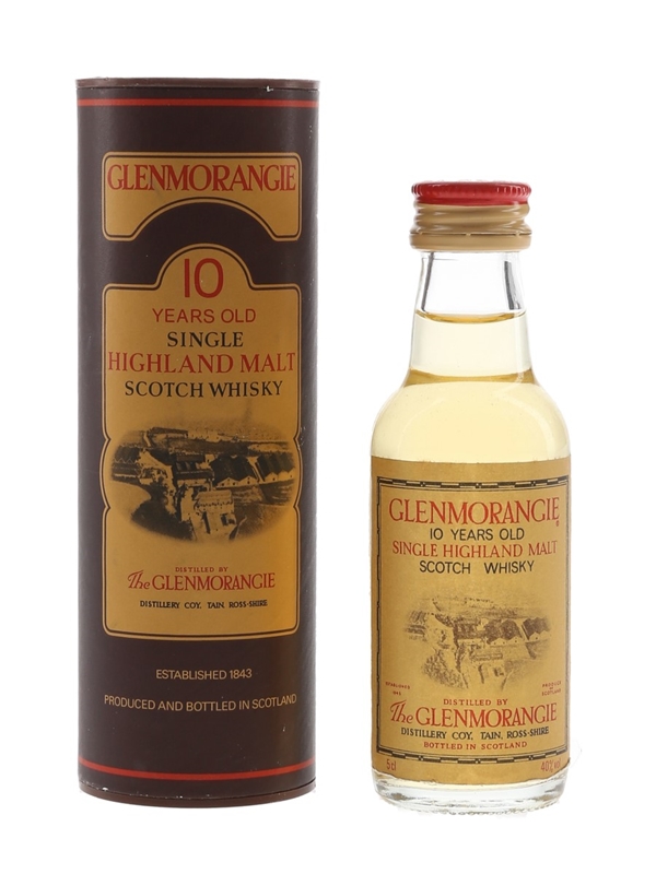 A miniature bottle of Glenmorangie 10 Year Old Single Highland Malt Scotch Whisky. We estimate this was bottled in the 1980s.