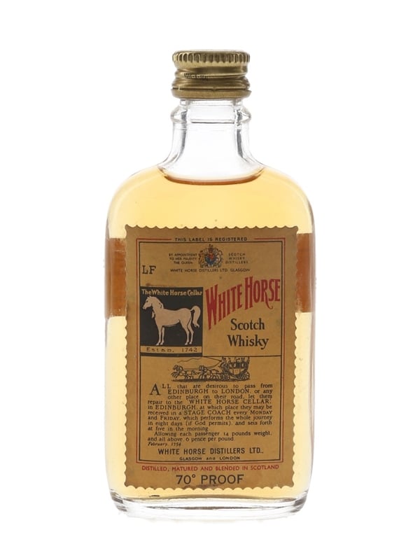 A miniature bottle of White Horse Scotch Whisky, produced by White Horse Distillers Ltd. We estimate this was bottled in the 1960s.