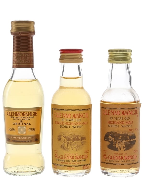 This lot contains three miniature bottles of Glenmorangie 10 Year Old Single Highland Malt Scotch Whisky. We estimate these were bottled in the 1980s and 2000s.