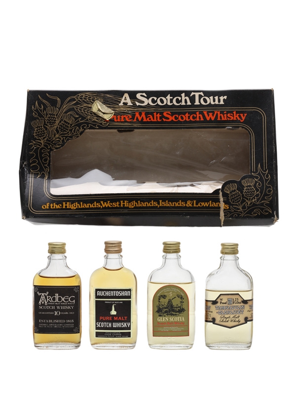 A Scotch Tour set produced by Cumbrae Supply Co. contains four miniature bottles of Pure Malt Scotch Whisky from Islay, Campbeltown, Speyside and the Lowlands. We estimate these were bottled in the 1970s: