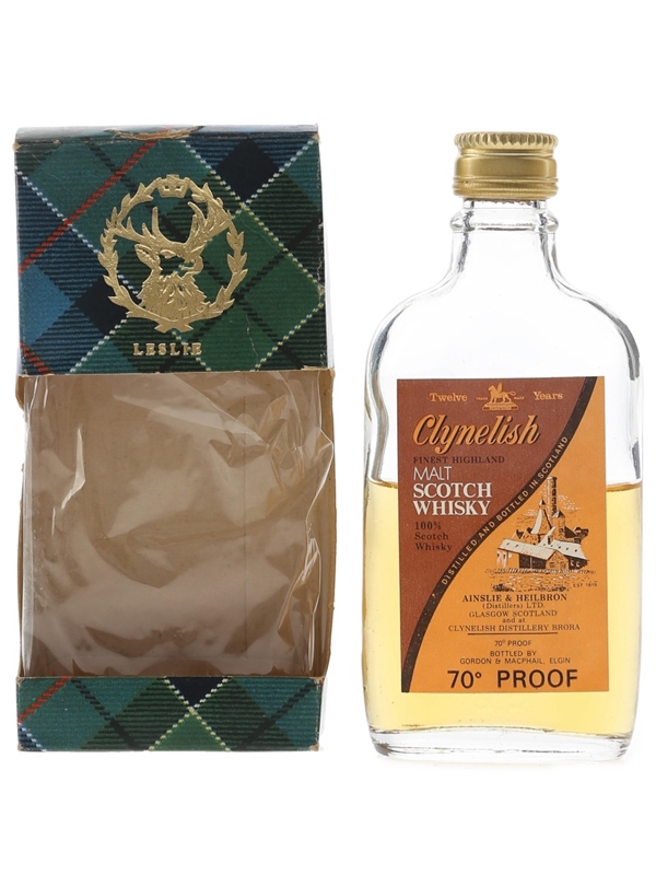 A miniature bottle of Clynelish 12 Year Old Finest Highland Malt Scotch Whisky produced by Ainslie & Heilbron (Distillers) Ltd. This was bottled by Gordon & MacPhail, we estimate in the 1970s.