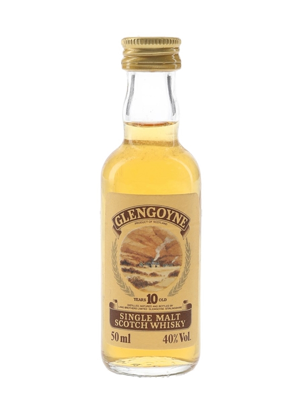A miniature bottle of Glengoyne 10 Year Old Single Malt Scotch Whisky, bottled by Lang Brothers. We estimate this was bottled in the 1980s.