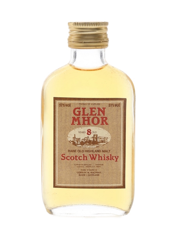 A miniature bottle of Glen Mhor 8 Year Old Rare Old Highland Malt Scotch Whisky bottled at 57% ABV by Gordon & MacPhail, we estimate in the 1980s.