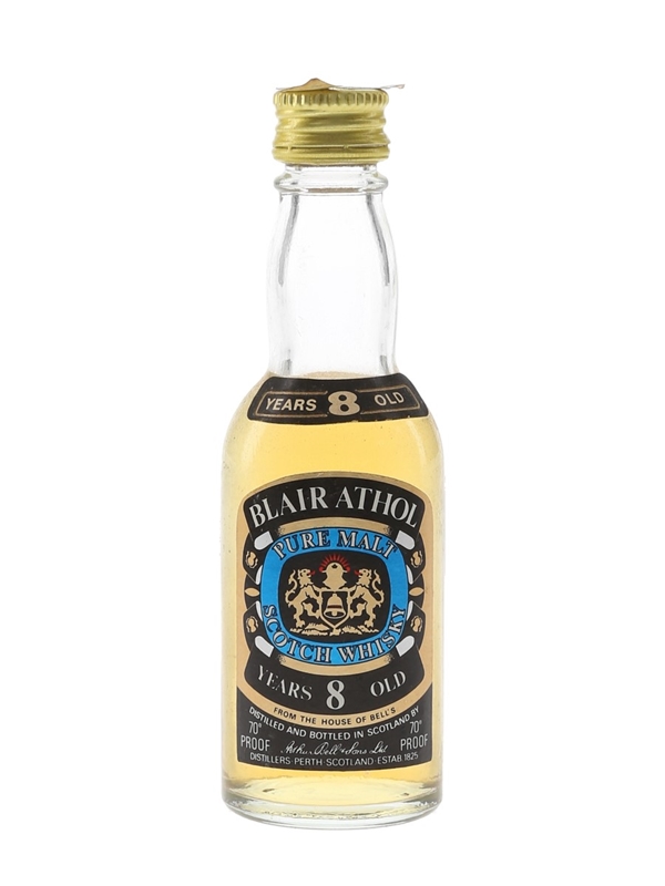 A miniature bottle of Blair Athol 8 Year Old Pure Malt Scotch Whisky from The House Of Bell's, distilled and bottled by Arthur Bell & Sons. We estimate this was bottled in the 1970s.