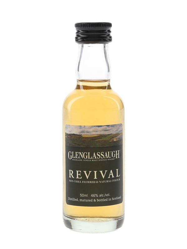 A miniature bottle of Glenglassaugh Revival Highland Single Malt Scotch Whisky, the first whisky produced at the distillery since it reopened in 2008. This was matured in refill and new oak barrels and finished in sherry casks.