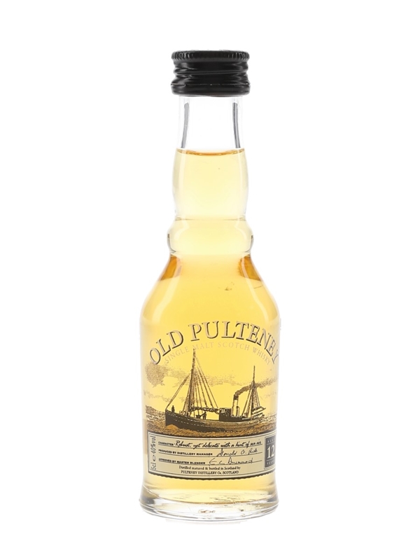 A miniature bottle of Old Pulteney 12 Year Old Single Malt Scotch Whisky with a screen printed label.