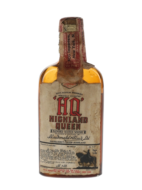 A miniature bottle of Highland Queen Blended Scotch Whisky, blended and bottled by Macdonald & Muir Ltd. This was bottled for the American market and imported by FCG, we estimate in the 1930s to 1940s.