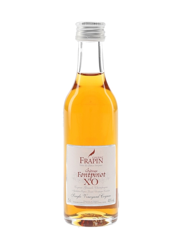 A miniature bottle of Frapin XO Single Vineyard Cognac, produced at Château de Fontpinot in the Grande Champagne region.