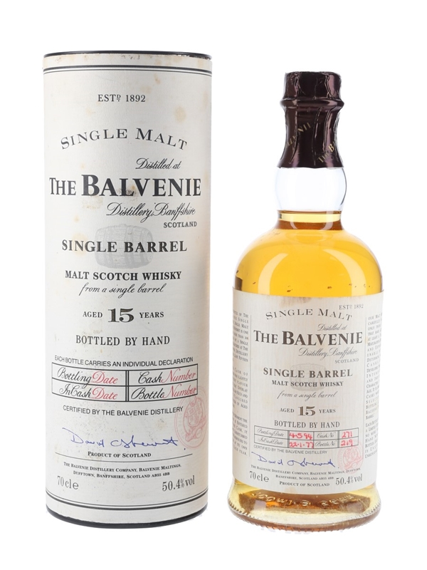 A bottle of Balvenie 15 Year Old Single Barrel Malt Scotch Whisky. This was distilled on 22 January 1977, matured in a single barrel and bottled on 4 May 1994.