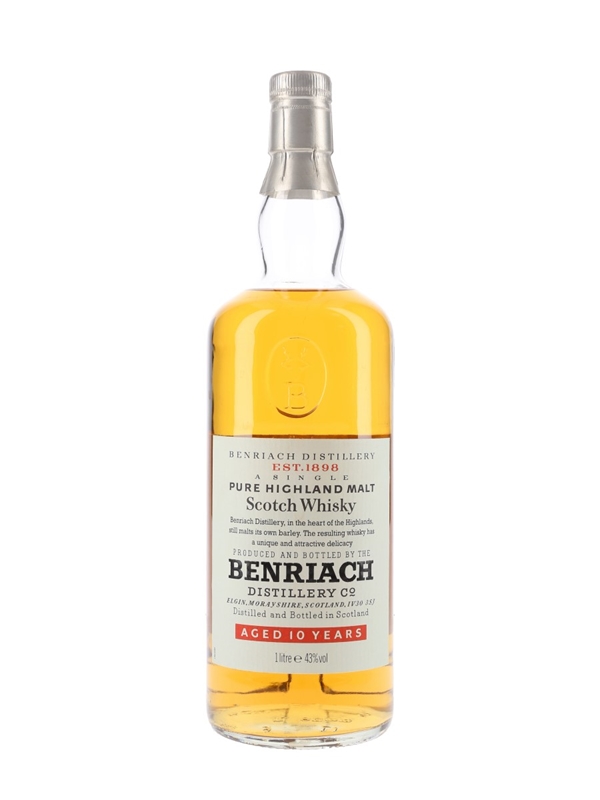A litre bottle of Benriach 10 Year Old Pure Highland Malt Scotch Whisky. We estimate this was bottled in the 1990s.
