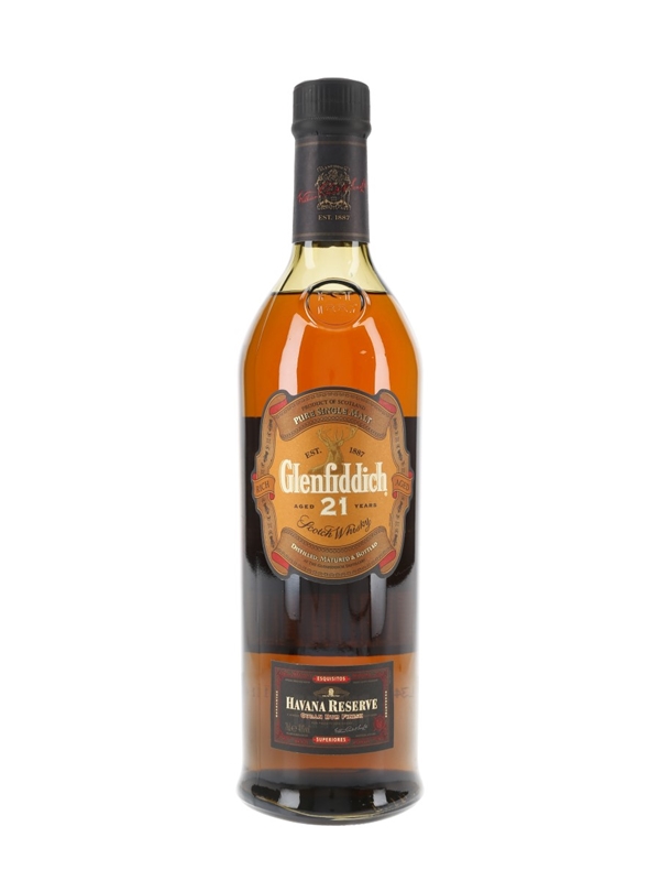 A bottle of the first release of Glenfiddich 21 Year Old Havana Reserve Pure Single Malt Scotch Whisky, finished in Cuban rum casks. This expression was originally called Havana Reserve, but later batches were named Gran Reserva.