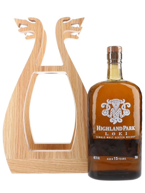 A bottle of Highland Park Loki 15 Year Old Single Malt Scotch Whisky. This is the second release in Highland Park's Valhalla Collection, named after Loki, a figure from Norse mythology. The son of two giants, he revels in mischief and treachery and constantly challenges the gods.