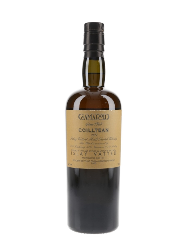 A bottle of Islay Vatted Malt Scotch Whisky, a blend including Laphroaig (45%), Bowmore (30%) and Ardbeg (5%). The whiskies were distilled in 1992 and bottled in 2012 by Coilltean Ltd. This was exclusively selected by Samaroli for La Maison Du Whisky.