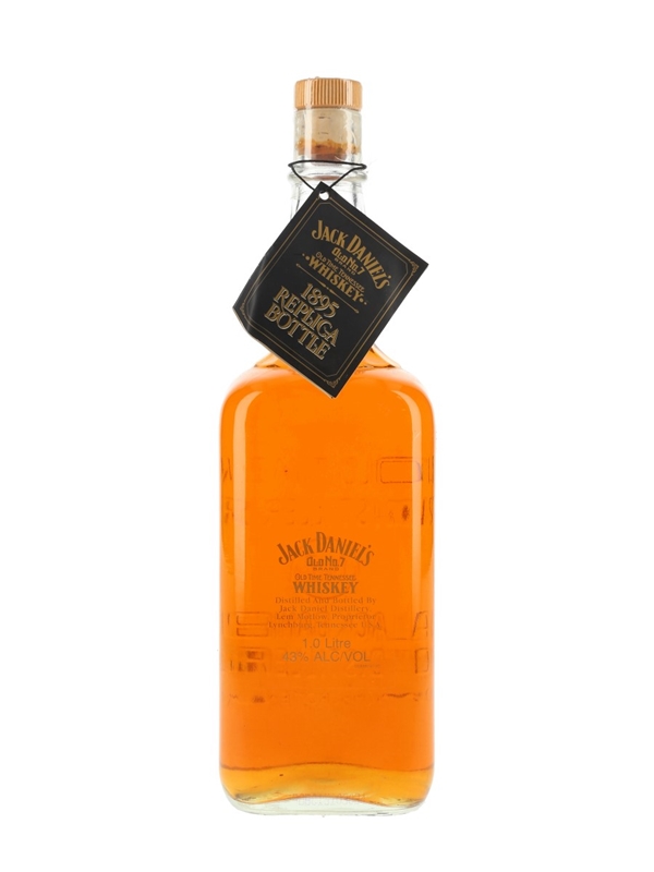 A litre bottle of Jack Daniel's No.7 Old Time Tennessee Whiskey, the 1895 Replica bottle. In the beginning, Jack Daniel's was sold in kegs, barrels, and stoneware jars. The familiar square bottle was first used in 1895.