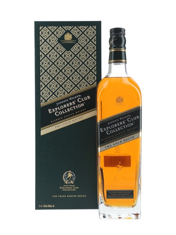 A litre bottle of Johnnie Walker Explorers' Club Collection blended Scotch whisky. The Gold Route is the second release from the Explorers' Club Collection and it was inspired by the Walker family's journeys from Central America and along the coast of the Pacific Ocean.