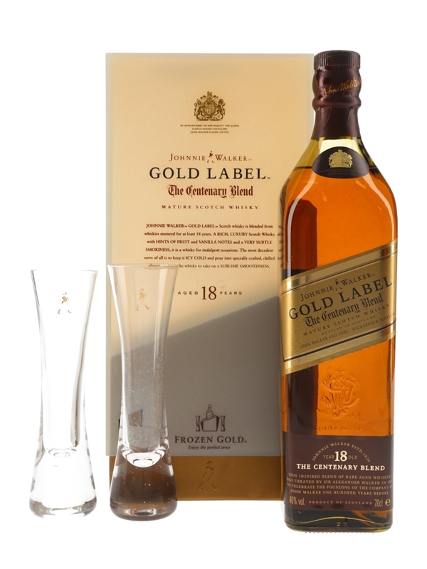 A bottle of Johnnie Walker Gold Label 18 Year Old The Centenary Blend Frozen Gold Scotch Whisky, released before the brand dropped the age statement. This comes with two glasses in a presentation box.