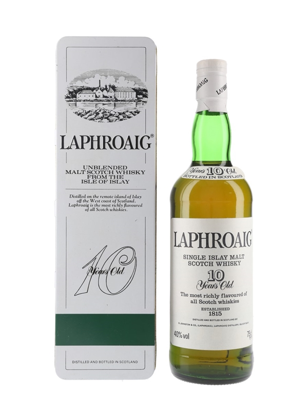 A bottle of Laphroaig 10 Year Old Single Malt Scotch Whisky in a presentation tin. We estimate this was bottled in the 1980s.
