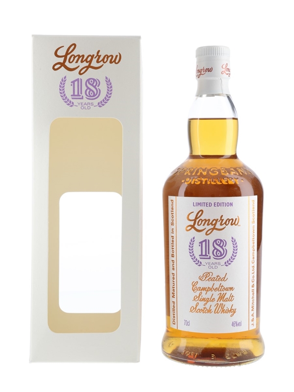 A bottle of Longrow 18 Year Old Peated Campbeltown Single Malt Scotch Whisky from Springbank distillery. The bottling code indicates this was bottled in 2017.