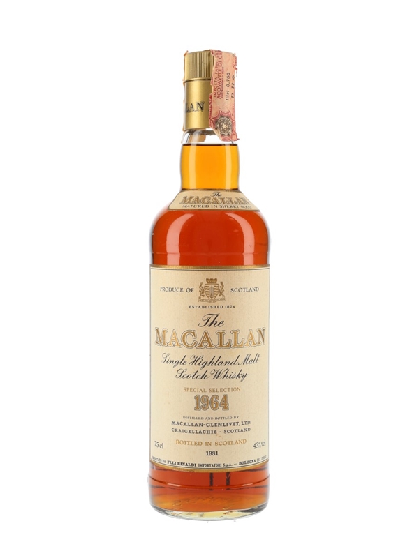 A bottle of The Macallan 1964 Single Highland Malt Scotch Whisky, matured in sherry casks and bottled in 1981. This was bottled for the Italian imported by Rinaldi.