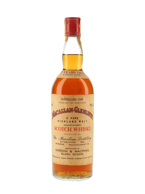 A bottle of The Macallan-Glenlivet 25 Year Old Pure Highland Malt Scotch Whisky. This was distilled in 1949, matured in sherry casks and bottled by Gordon & MacPhail. This was bottled for the Italian market and imported by Co. Import Pinerolo, we estimate in the 1970s.