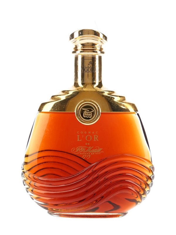 A bottle of Martell L'Or Cognac, a blend of eaux-de-vie from the Grande Champagne, Petite, Champagne and Borderies growing regions, with an average age of 60 years. This is presented in a crystal decanter decorated in 24 carat gold with a wave motif inspired by Cognac's undulating vineyards.