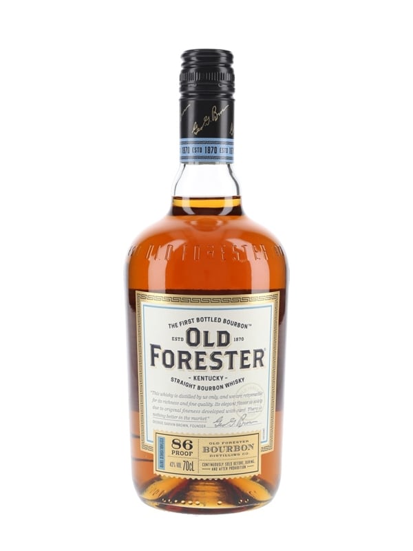 A bottle of Old Forester Kentucky Straight Bourbon Whiskey, bottled at 43% ABV.