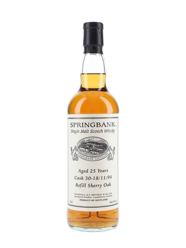 A private cask bottling of Springbank 25 Year Old Single Malt Scotch Whisky. This was distilled in 1994, matured in a refill sherry oak and bottled 46.6% ABV. The bottling code indicates this was bottled in 2020.