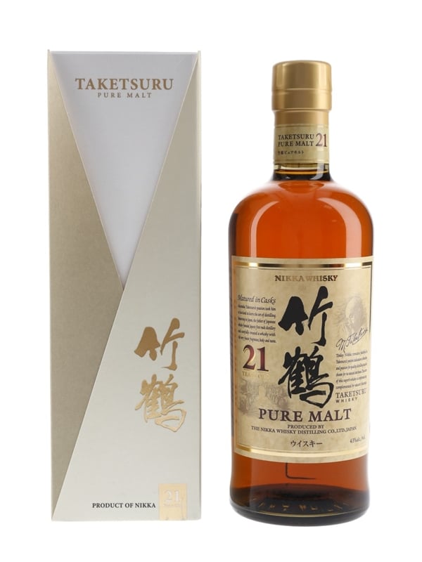A bottle of Nikka Taketsuru Pure Malt 21 Year Old Japanese Blended Malt Whisky.