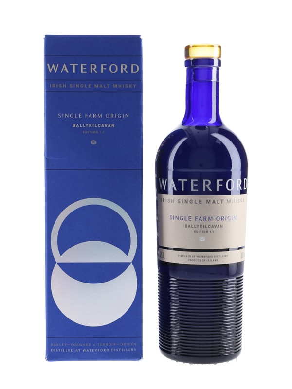 A bottle of Waterford Single Farm Origin Irish Single Malt Whisky, Ballykilcavan Edition 1.1. The barley for this whisky was grown in Ballykilcavan by David Walsh-Kemmis and harvested on 17 August 2015. This was distilled in the 8th week of 2016, matured for 3 years 11 months 18 Days and bottled in June 2020 at 50% ABV.