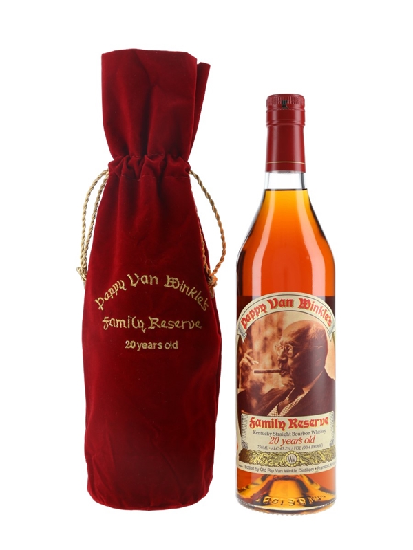 A bottle of Pappy Van Winkle's 20 Year Old Family Reserve Kentucky Straight Bourbon Whiskey, bottled by Old Rip Van Winkle Distillery, Frankfort and imported to England by Hi-Spirits. The bottling code indicates this was bottled in 2019.