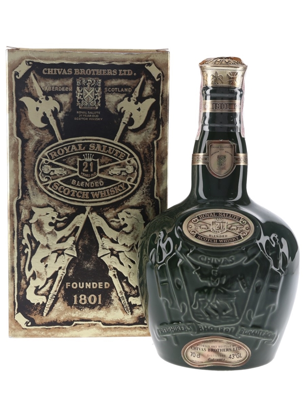 A bottle of Chivas Brothers' Royal Salute 21 Year Old presented in a green Wade decanter. This was imported to Hong Kong and Macau by Martell Far East Trading Ltd., we estimate in the 1980s.