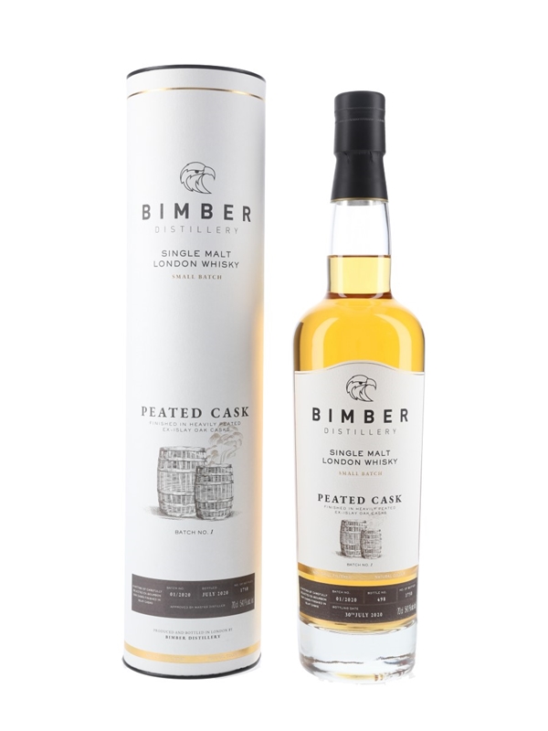 A bottle of Bimber Small Batch Single Malt London Whisky, matured in a combination of first fill bourbon barrels and quarter casks that previously held heavily peated Islay whisky. This was bottled on 30 July 2020.