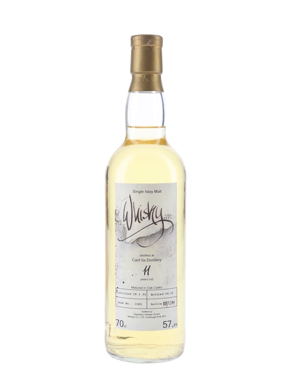A bottle of Caol Ila 11 Year Old Single Islay Malt Scotch Whisky. This was distilled on 28 January 1991, matured in oak casks and bottled April 2002 by Signatory Vintage for The Whisky Fair.