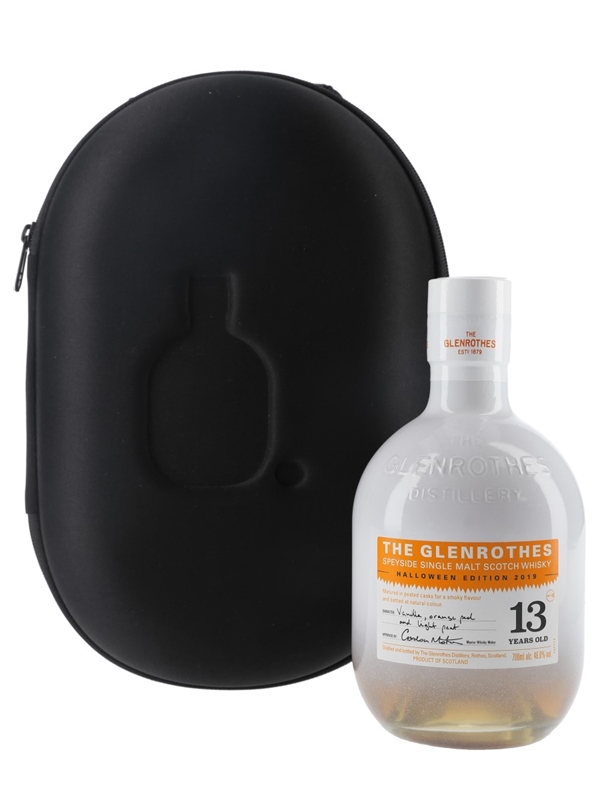 A bottle of The Glenrothes 13 Year Old Speyside Single Malt Scotch Whisky. This 2019 Halloween Edition was matured in peated casks and bottled at 46.6% ABV, and is presented in a carry case designed to accommodate a Glenrothes bottle.