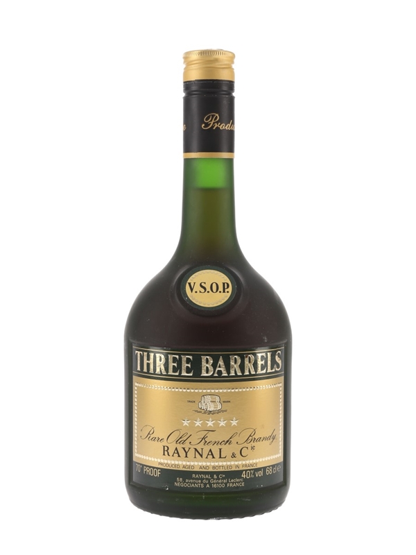 A 68cl bottle of Three Barrels VSOP 5 Star Rare Old French Brandy, produced by Raynal & Co. We estimate this was bottled in the early 1980s.