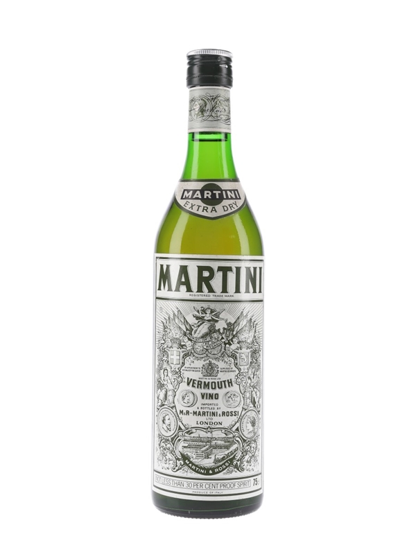A bottle of Martini Extra Dry Vermouth Vino. This was bottled and imported by Martini & Rossi Ltd., London, we estimate in the 1970s.