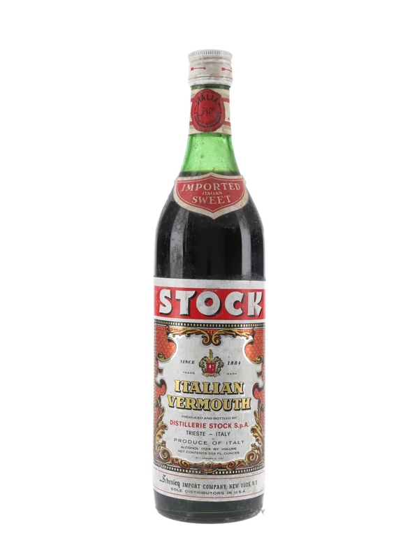 A litre bottle of Italian Sweet Vermouth produced by Stock, Italy. This was bottled for the US market and distributed by Schenley, New York, we estimate in the 1970s.