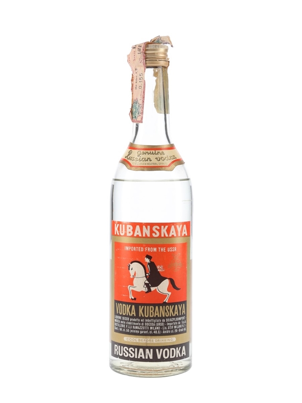A 50cl bottle of Kubanskaya Russian Vodka, produced and bottled by Sojuzplodimport, Moscow in Odessa. This was bottled for the Italian market and imported by Ramazzotti, we estimate in the 1970s.