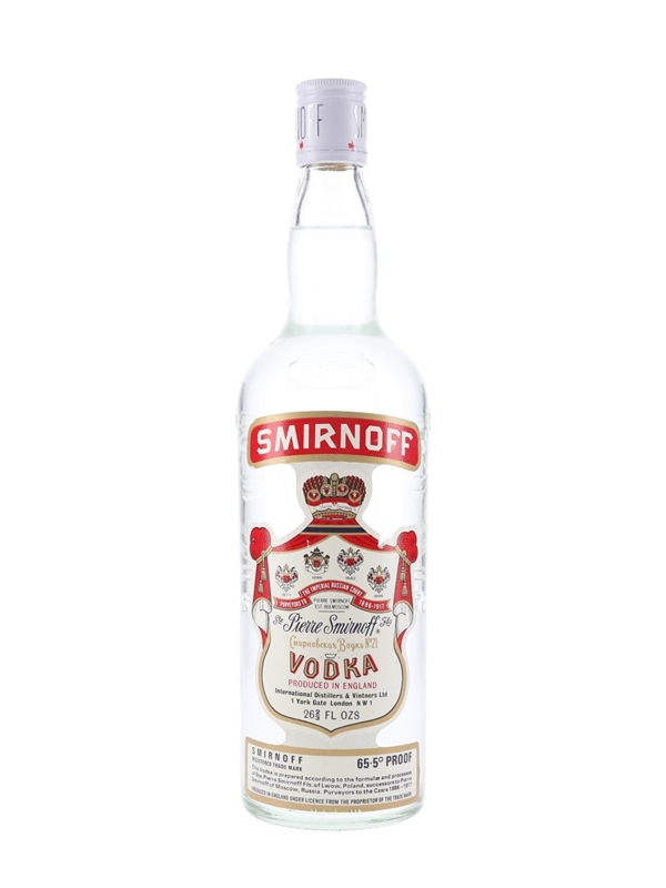 A bottle of Smirnoff Red Label vodka. This was produced and bottled in England under license from the proprietor of the Trade Mark. We estimate this was bottled in the 1970s.