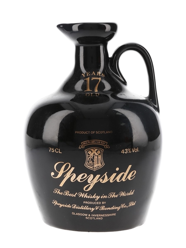 A ceramic decanter of Speyside 17 Year Old Single Malt Scotch Whisky, produced by Speyside Distillery & Bonding Co. Ltd. This was imported to Switzerland, we estimate in the 1980s.