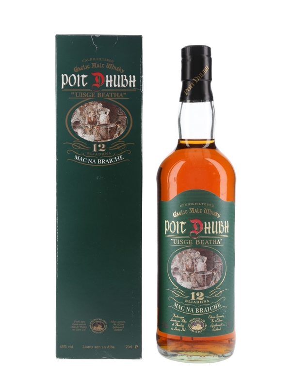 A bottle of Poit Dhubh 12 Year Old Green Label Gaelic Malt Whisky.