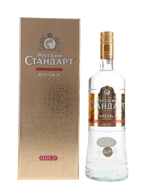 A litre bottle of Russian Standard Gold Label vodka. This was bottled for duty free stores.